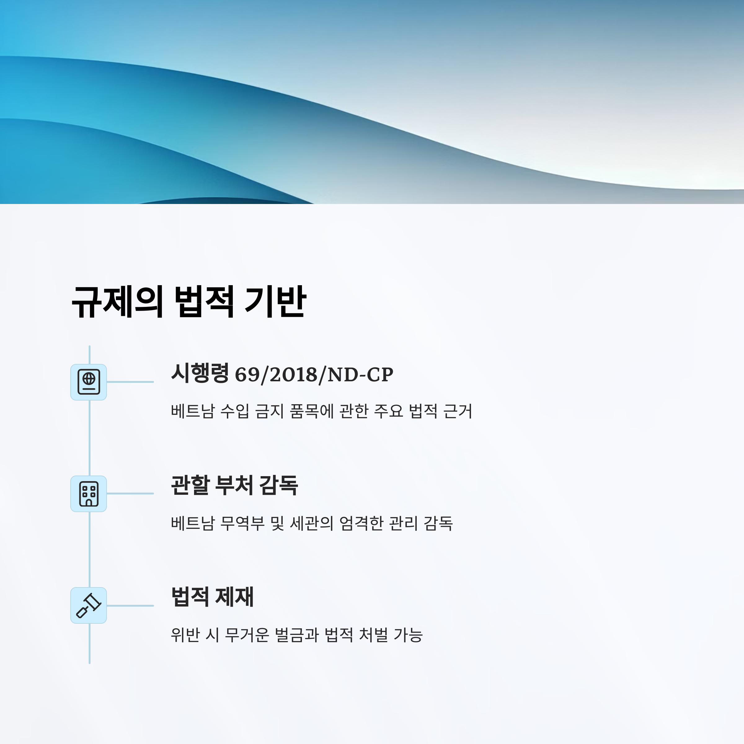 수입 금지 품목은 **베트남 정부가 안전, 환경보호, 공공질서 등의 이유로 원칙적으로 수입을 불허**하는 품목입니다. 어떠한 경우에도 정식 허가 없이는 수입할 수 없으며, 입항 시 세관에서 전량 반송 또는 폐기 처리됩니다.